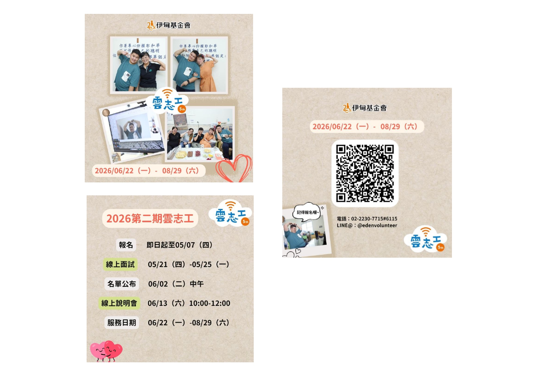 一、旨揭本次安排於115年06月22日(一)至08月29日(六)間,辦理『2026第二期雲志工』線上服務陪伴,伊甸看見服務使用者及志工們需求,隨著時代與科技的進步,打破舊有服務陪伴方式,透過視訊讓志工服務不遙遠且拉近彼此之間距離。